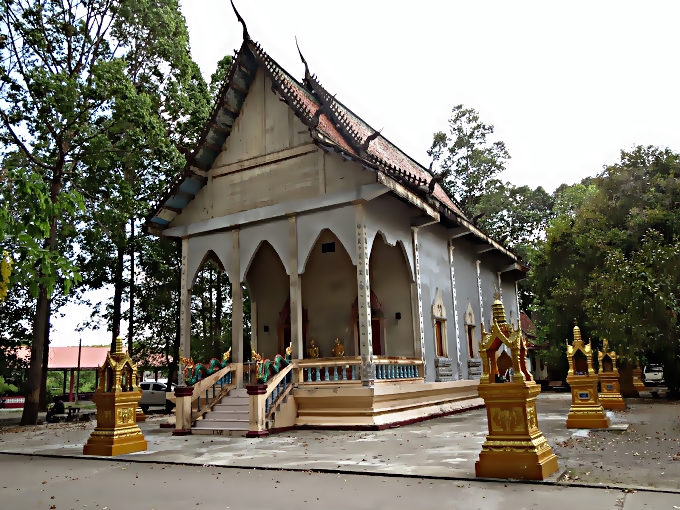 อุโบสถ กว้าง ๙ เมตร ยาว ๒๑ เมตร เป็นอาคารเสริมคอนกรีด สร้างเมื่่อ พ.ศ. ๒๔๘๗
